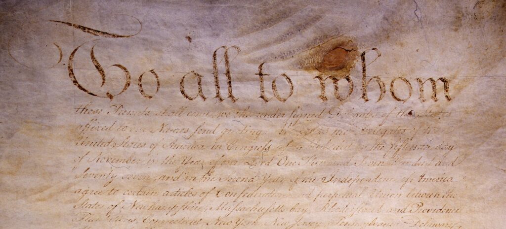 To all to whom these Presents shall come, we, the undersigned Delegates of the States affixed to our Names send greeting. Whereas the Delegates of the United States of America in Congress assembled did on the fifteenth day of November in the year of our Lord One Thousand Seven Hundred and Seventy seven, and in the Second Year of the Independence of America agree to certain articles of Confederation and perpetual Union between the States of Newhampshire, Massachusetts-bay, Rhodeisland and Providence Plantations, Connecticut, New York, New Jersey, Pennsylvania, Delaware, Maryland, Virginia, North Carolina, South Carolina, and Georgia in the Words following, viz. “Articles of Confederation and perpetual Union between the States of Newhampshire, Massachusetts-bay, Rhodeisland and Providence Plantations, Connecticut, New York, New Jersey, Pennsylvania, Delaware, Maryland, Virginia, North Carolina, South Carolina, and Georgia.